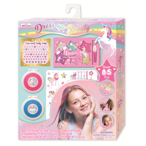 Ce coffrent licorne Dress up Beauty Comprend :1 x feuille de gemmes visage/corps ;2 x feuilles de tatouage pour le visage2 x curseurs de craie pour cheveux ;1 x palette de fards à paupières pailletés avec applicateur