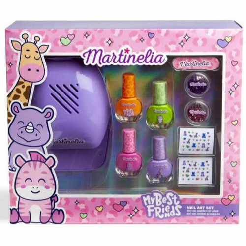 Comprend : 1 sèche-ongles violet, 4 vernis à ongles de couleurs assorties (violet, rose, vert et orange), 2 pots à paillettes violets et roses, 2 feuilles de mini autocollants et 1 mini lime à ongles.