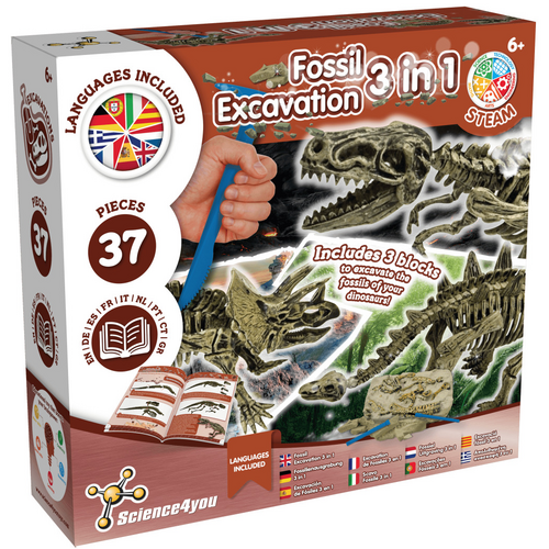 AvecFossil Excavations 3 en 1,découvrez lesfossiles de vos dinosaures préféréset devenez un véritable paléontologue. Ce jouet scientifique comprend tous les outils nécessaires pour explorer les 3 blocs de ce kit. Grâce à cemanuel pédagogique,vous apprendrez de nombreux faits intéressants sur les fos