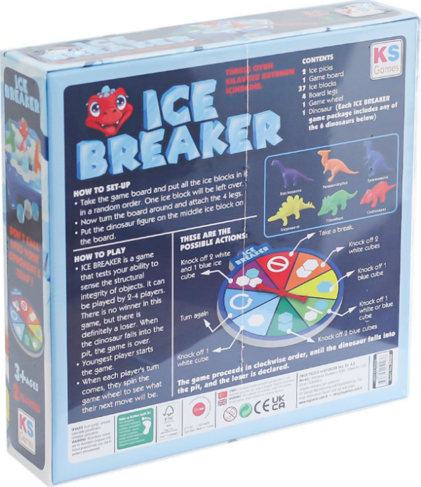 Ice Breaker KS GAMES Ne tombez pas dans le piège de votre adversaire ! 2 joueurs Contenu – 2 pics à glace – 1 plateau de jeu – 37 blocs de glace – 4 pieds en bois – 1 roue de jeu boîte de dinosaure Taille : 6,5 x 27,3 x 27,5 cm Âge : 3+