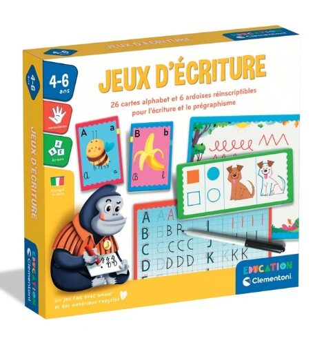 Un coffret amusant contenant 26 cartes illustrées, 3 ardoises, un feutre et une éponge pour apprendre à écrire.L’enfant pourra s’exercer autour de différentes activités progressives de prégraphisme et d’écriture de lettres et de mots en majuscules et minuscules, en script et en cursives.Un jeu idéal