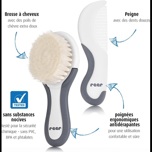 Kit de soins capillaires 2 pièces avec brosse à poils de chèvre et peigne à croûte REER Le kit d’entretien 2 pièces se compose d’une brosse en poils de chèvre naturelle et d’un peigne à franges Les poils naturels doux assurent un soin en douceur des cheveux de bébé Peigne à dents souples pour enlever les croûtes de lait en toute sécurité La poignée antidérapante assure une sécurité optimale lors des soins de bébé Achetez et commandez en ligne ou découvrez cet article de bébé dans notre magasin de jouets et articles bébé à Tunis, Tunisie. Pour plus d’informations visiter le site officiel REER
