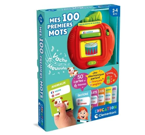 50 cartes recto verso pour apprendre les premiers mots et l’anglais.Deux modes de jeu : Exploration, avec des sons et des mélodies, et Quiz pour faciliter l’apprentissage.Insère la carte, appuie sur le bouton et écoute le nom et le son de l’image représentée.6 catégories différentes : Animaux, Véhic