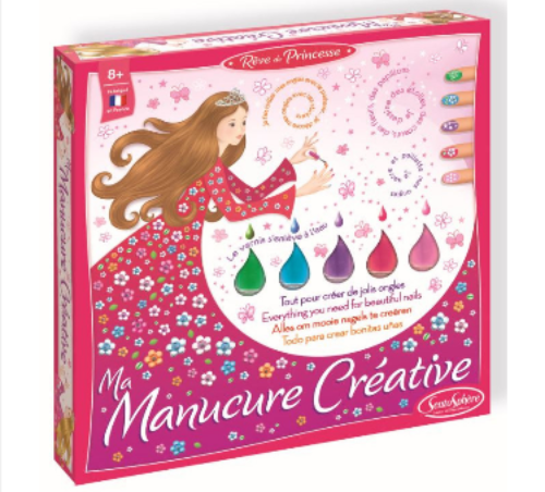 Un coffret très tendance pour s’inventer des mains de princesse :les petites filles vont pouvoir, le temps d’un après-midi, peindre leurs ongles en vert, bleu ou rose, mais au premier lavage ces excentricités disparaîtront, ce qui rassurera les mamans les plus classiques. Pour celles qui auront