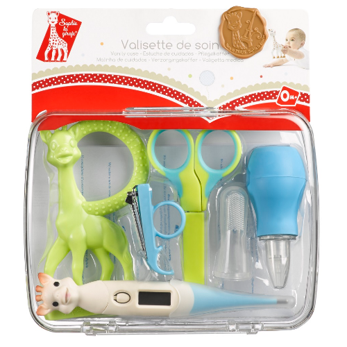 Tous les indispensables pour les soins de bébé réunis dans une valisette en plastique !Contient :1 thermomètre médical électronique1 paire de ciseaux1 coupe ongles ergonomique1 mouche bébé à poire1 masse-gencives en silicone1 anneau de dentition souple Sophie la girafe au bon parfum de vanille